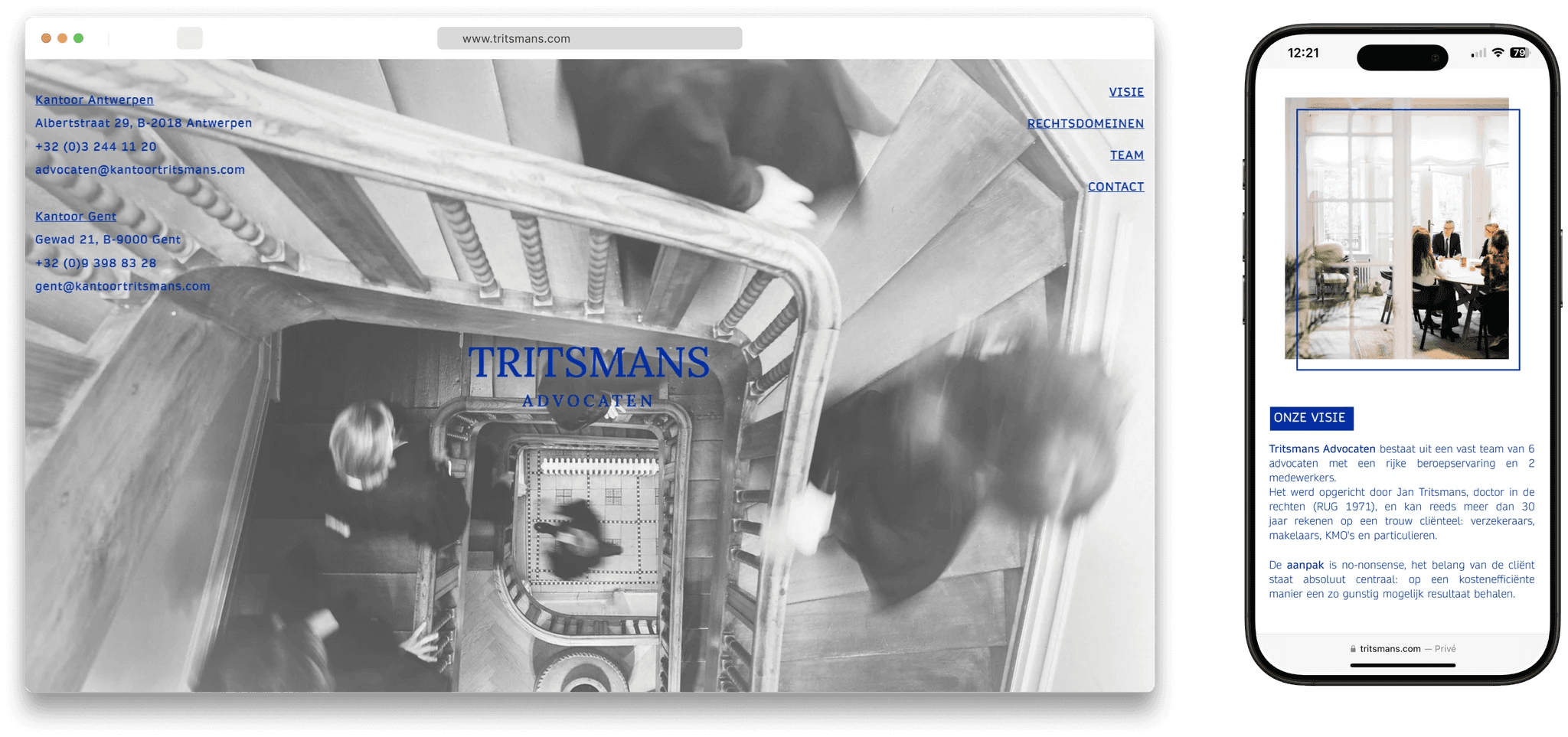 Het nieuwe webdesign geeft Tritsmans een moderne uitstraling die zowel professioneel als functioneel is. Ik heb de lay-out geoptimaliseerd met duidelijke, visueel aantrekkelijke elementen die het vertrouwen van bezoekers wekken. De combinatie van stijl en functionaliteit zorgt ervoor dat de website niet alleen visueel aantrekkelijk is, maar ook effectief de diensten en expertise van het kantoor communiceert.
