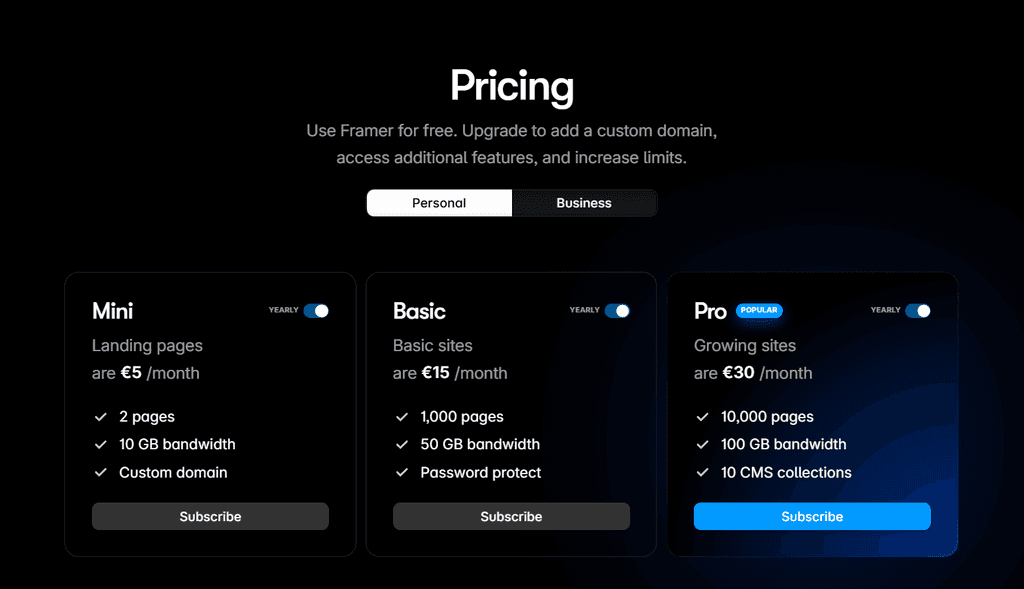 Hosting: Framer’s cloudhosting is razendsnel, stabiel en wereldwijd beschikbaar, zodat jouw website altijd en overal optimaal presteert.